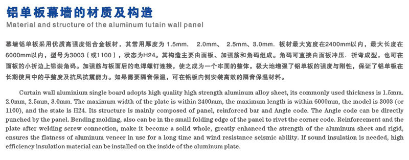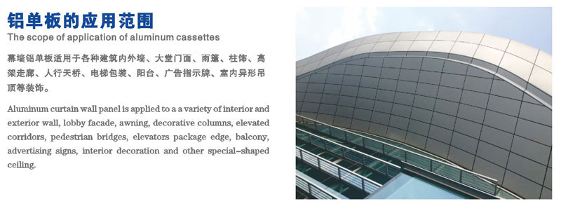 鋁單板:它擁有重量輕、強(qiáng)度高、可塑性強(qiáng)和耐腐性強(qiáng)等優(yōu)點(diǎn);加工工藝簡(jiǎn)單,該產(chǎn)品是適用于裝飾大廈外墻、梁柱、陽臺(tái),深受廣大用戶的青睞。