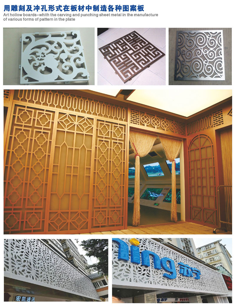 藝術(shù)雕花板:雕花鋁單板憑著先進(jìn)的生產(chǎn)技術(shù)設(shè)備,加工工藝復(fù)雜,色彩可選取性廣泛,裝飾效果好,環(huán)保無(wú)毒,盡顯個(gè)性化,表抗靜電不吸塵且容易清洗等,且安裝簡(jiǎn)單。